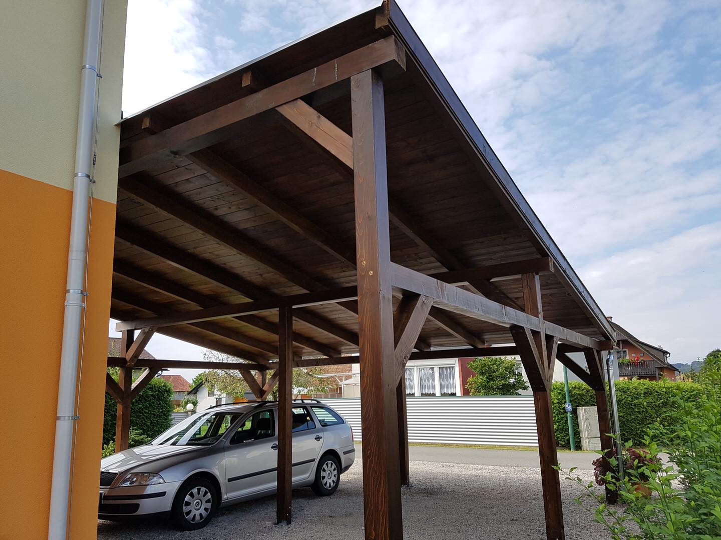 7 méter × 7 méteres zsindelyes dupla kocsi beálló