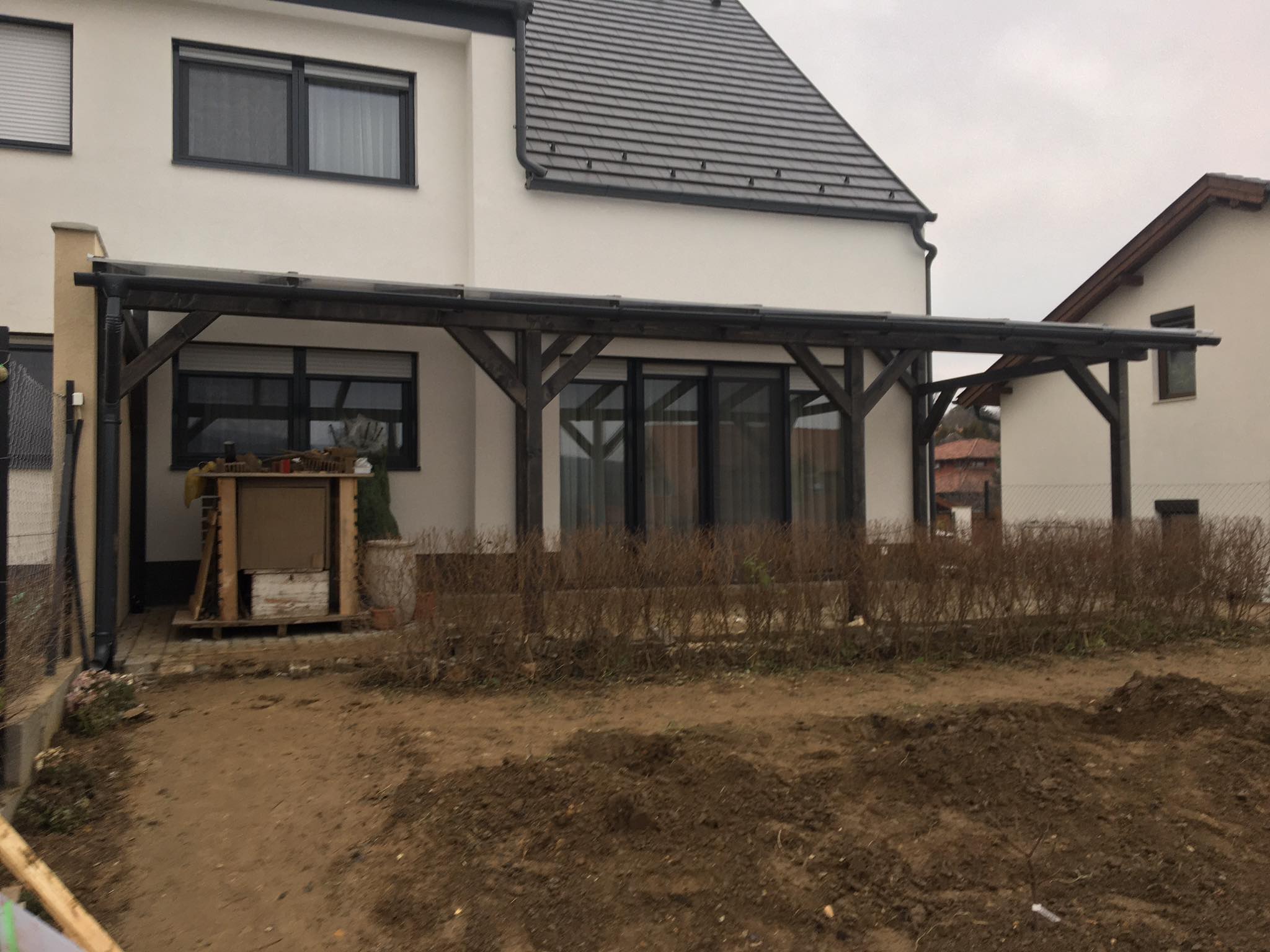 8,4 méter hosszú és 3 méter széles terasz polikarbonát fedéssel