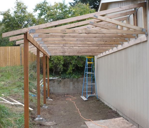 Féltetős négy lábas/oldal, fél nyitott oldalú kocsibeálló fa szerkezete